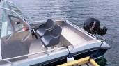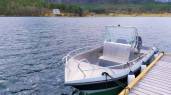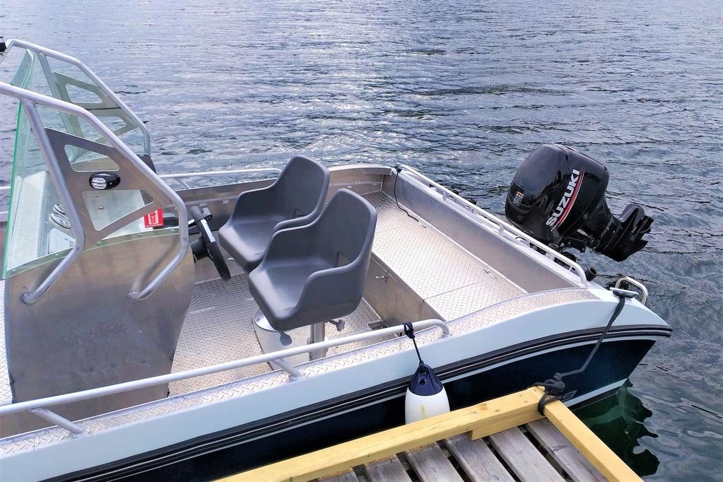 Ein Aluminiumsboot Kaasbøll 19-Fuß / 50 PS Motorboot mit Lenkradsteuerung kann gegen Aufpreis von 600€/ Wo. gemietet werden. Am Boot sind Ruttenhalter, Echolot, GPS, Kartenplotter, Rettungswesten und Seekarten.